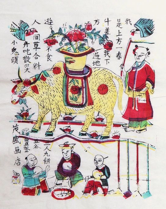 年画叙事的主题是吉祥寓意。《福寿三多》中佛手、石榴、寿桃构成的固定组合,形成“福报—多子—延年”的复合型语义场。《春牛图》里稻穗、芒神、节气铭文的时空叠合,构建出“农事—天时—丰饶”的立体叙事网络。朱仙镇门神画中,历史人物秦琼、尉迟恭被赋予了“驱邪纳福”的双重神格,其兵器纹饰下缀的蝙蝠符号将强力的威慑转化为吉祥守护。高密年画《文武财神》通过文财神比干的如意与武财神关公的大刀,将儒家“义利之辨”转化为商业伦理的视觉表征。