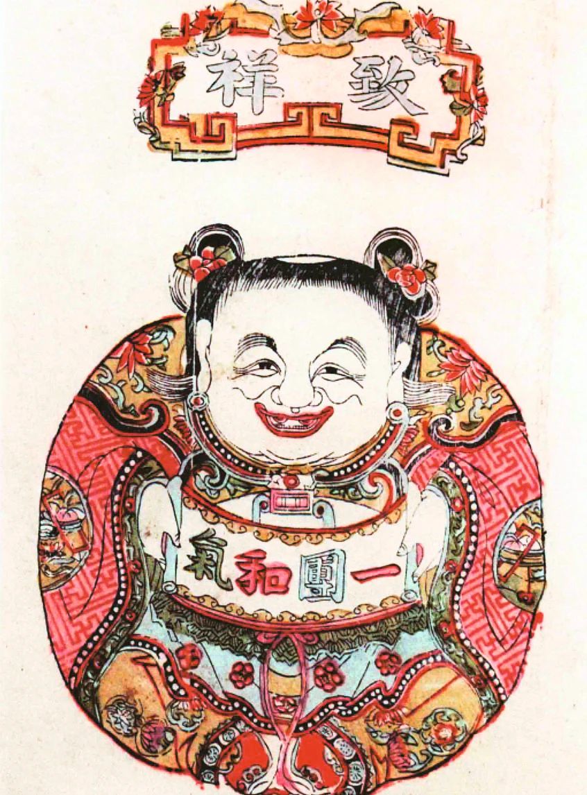 年画蕴含着农耕时期的生产生活方式和朴素的民间理想。出于农事活动的需要,年画成为了标识时间、空间和生活礼俗的重要载体,其图示中也常常蕴含着天地人和谐的理念。比如年画“天地三界”以图文并茂的形式,分层排列表现天地人神的宇宙观念;“一团和气”则采用圆形适合填充的形式,塑造出憨态可掬的大阿福形象,那圆润饱满的姿态,象征着圆满祥和的内涵;武强年画“六子争头”更是构思精巧,三个小童首脚相连,形成了六个童子的共生图形,寓意着“六顺”。这些年画特有的图示,表现了天人合一、圆圆满满、和谐共生等丰富的民间理想。
