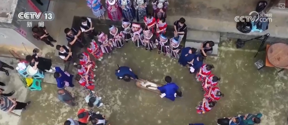 端午节期间,贵州省瓮安县的苗族同胞身着节日盛装,包粽子、打糍粑。人们将煮好的糯米放入石臼中,伴随着欢快的歌声轮流捶打。能歌善舞的苗族同胞吹响芦笙,跳起欢快的传统舞蹈“九龙穿洞”,将节日气氛推向高潮。