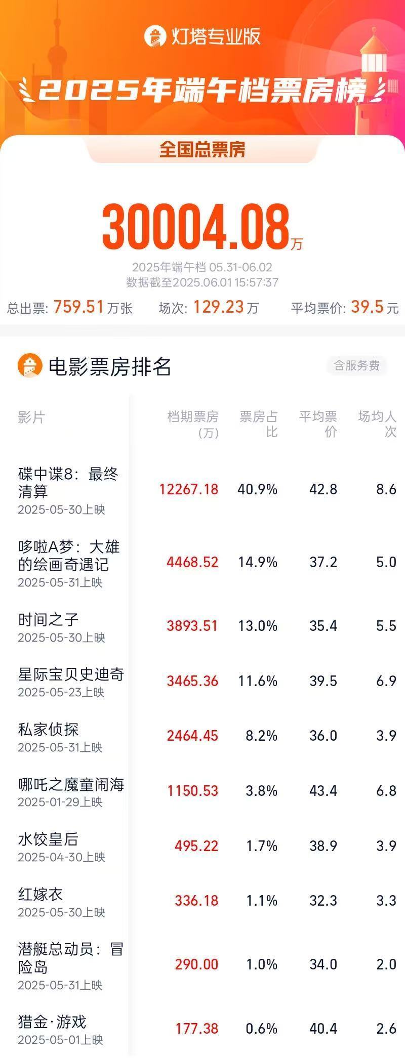 据网络平台数据,截至6月1日15时57分,2025年端午档(5月31日—6月2日)档期内电影票房(含预售)突破3亿,大幅超越去年端午档票房。