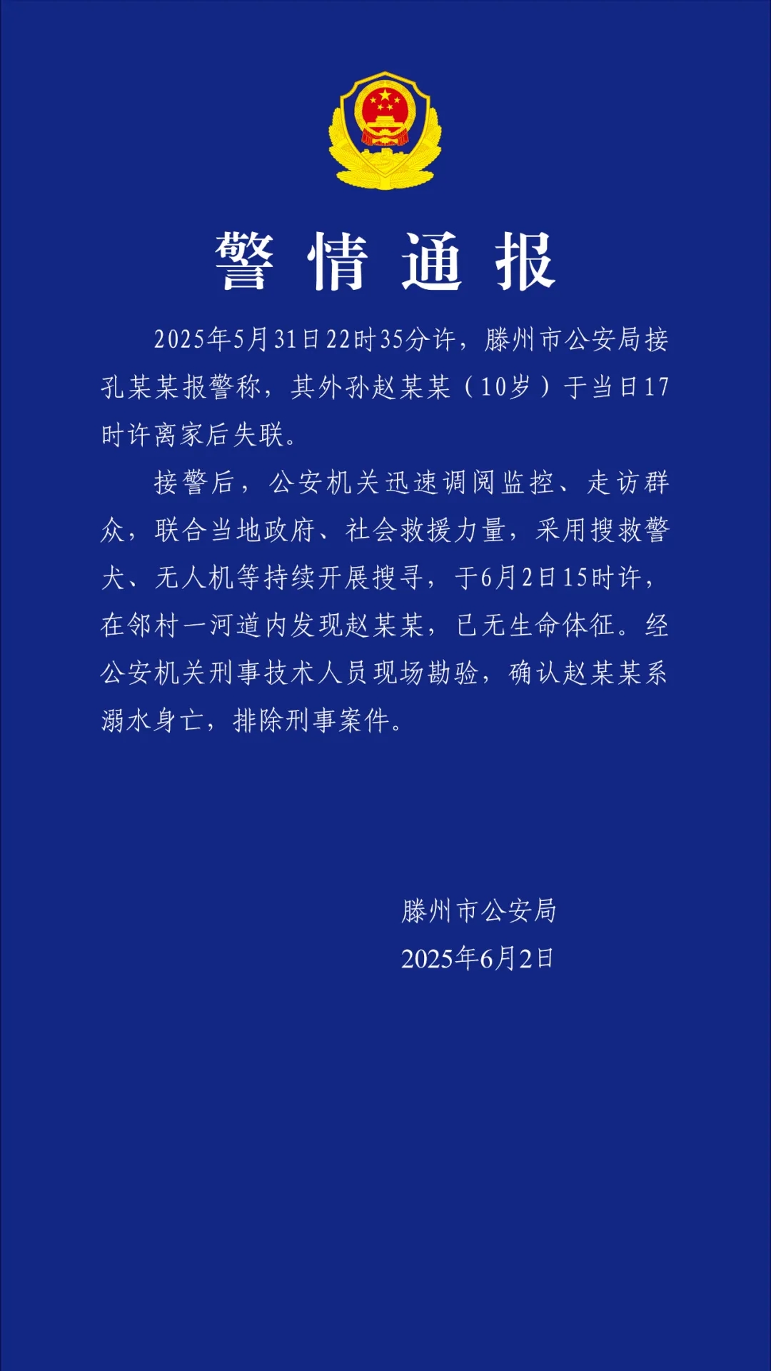 央视网消息:据滕州市公安局,2025年5月31日22时35分许,滕州市公安局接孔某某报警称,其外孙赵某某(10岁)于当日17时许离家后失联。