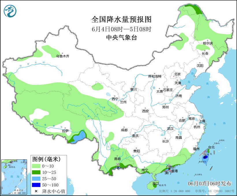 6月3日至4日,台湾岛大部、广东南部沿海、福建东南部沿海、海南岛东部、云南西部和东南部、西藏东南部等地的部分地区有大雨,局地有暴雨或大暴雨(100~150毫米)。