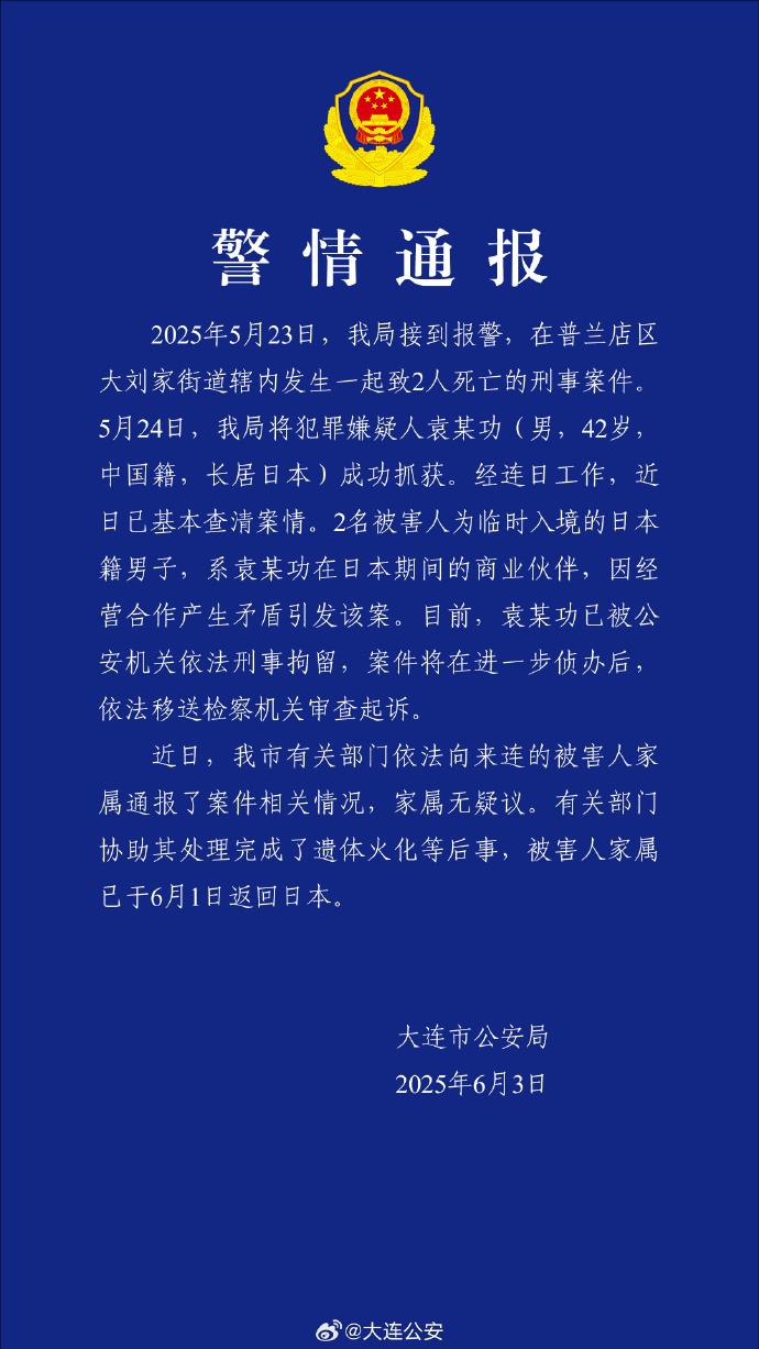 2025年5月23日,该局接到报警,在普兰店区大刘家街道辖内发生一起致2人死亡的刑事案件。5月24日,该局将犯罪嫌疑人袁某功(男,42岁,中国籍,长居日本)成功抓获。经连日工作,近日已基本查清案情。2名被害人为临时入境的日本籍男子,系袁某功在日本期间的商业伙伴,因经营合作产生矛盾引发该案。目前,袁某功已被公安机关依法刑事拘留,案件将在进一步侦办后,依法移送检察机关审查起诉。