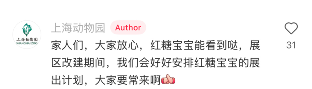 对此,上海动物园在社交平台答复:“家人们,大家放心,红糖宝宝能看到哒,展区改建期间,我们会好好安排红糖宝宝的展出计划,大家要常来啊。”