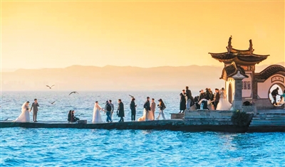 多对新人在云南大理洱海边拍摄婚纱照。赵 渝摄