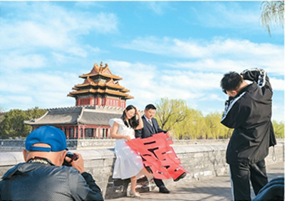 一对情侣在北京故宫角楼处拍摄新婚照片。新华社记者 李 贺摄