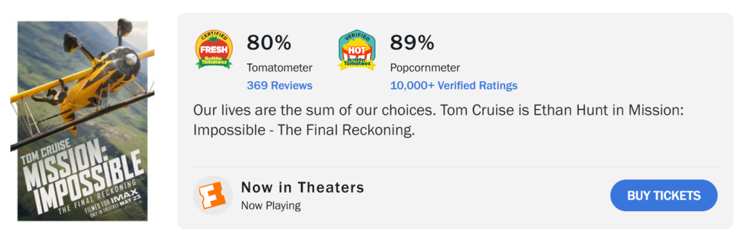 作为好莱坞经典IP《碟中谍》系列的收官之作,《碟中谍8:最终清算》在档期开始前就领跑预售票房。截至6月3日16时,《碟中谍8:最终清算》在中国大陆累计票房已经超过2.37亿元,成为2025年进口片票房冠军。