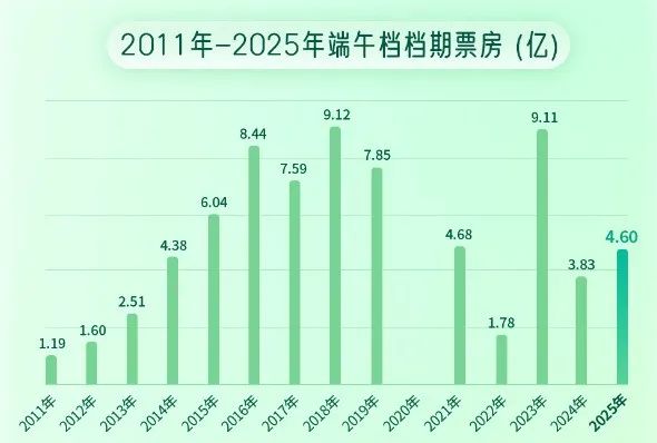据猫眼专业版,2025年端午档(5月31日至6月2日)总票房约4.60亿元,较2024年端午档3.83亿元票房增长了两成。