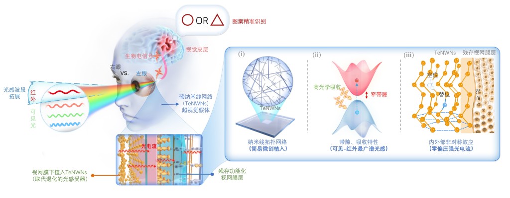 研究显示,该团队开发出全球首款光谱覆盖范围极广(470-1550nm,从可见光延伸至近红外二区)的视觉假体,该假体无需依赖任何外部设备,即可使失明动物模型恢复可见光视觉能力,还能赋予动物感知红外光,甚至识别红外图案的“超视觉”功能,也就是在黑暗中也能看见事物。