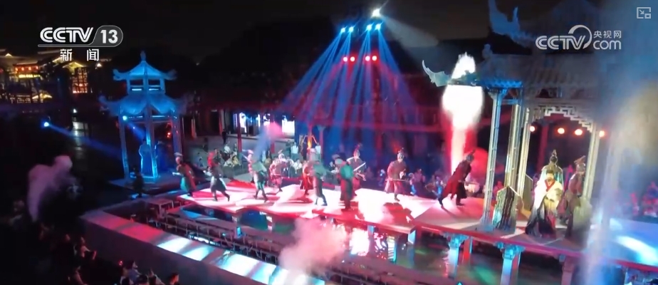 为了展现“赤壁大战”的激烈,现场运用了水、火、雾、声、光、电以及机械装置的全方位演艺。整个舞台的设计非常用心,就像是一艘大船,船的不同部位随着“战争”的进行还会上下起伏,仿佛真的行驶在波涛汹涌的大江之上。通过航拍画面可以看到,在整个街区中,《只此琅琊》的部分有500米左右,游客们来到这里,可以一秒踏进历史,走进千年琅琊文化历史画卷。在这里,不仅有“诸葛三兄弟纵横三国”,还有“东汉琅琊王刘京迁都”,以及“琅琊名士王羲之和颜真卿跨越千年的书法对话”等历史故事。