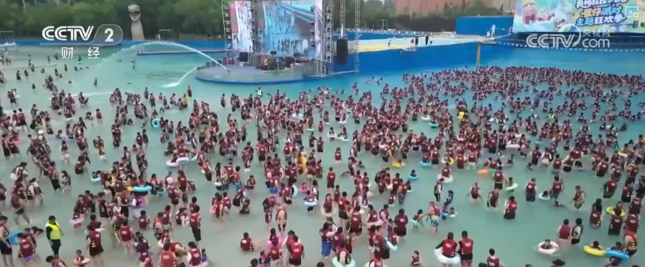 记者在河南郑州看到,一个水上乐园入口处,前来体验水上项目的游客排起长队。乐园内的巨型造浪池、彩虹滑道等项目都备受欢迎。