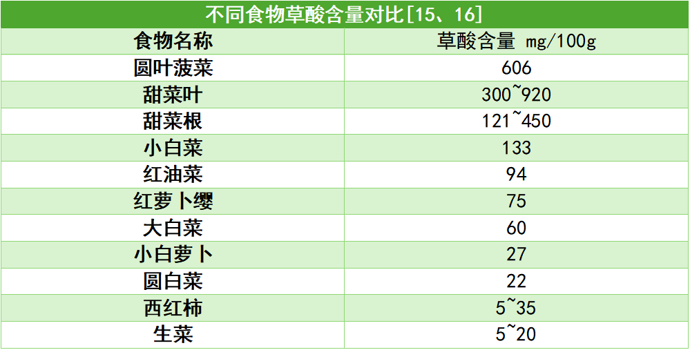 另外,甜菜根属于高草酸食物。有数据显示:甜菜根的草酸含量虽然没有菠菜高(606mg/100g),但比我们常吃的生菜、西红柿、卷心菜、苹果等都高,为121~450mg/100g。