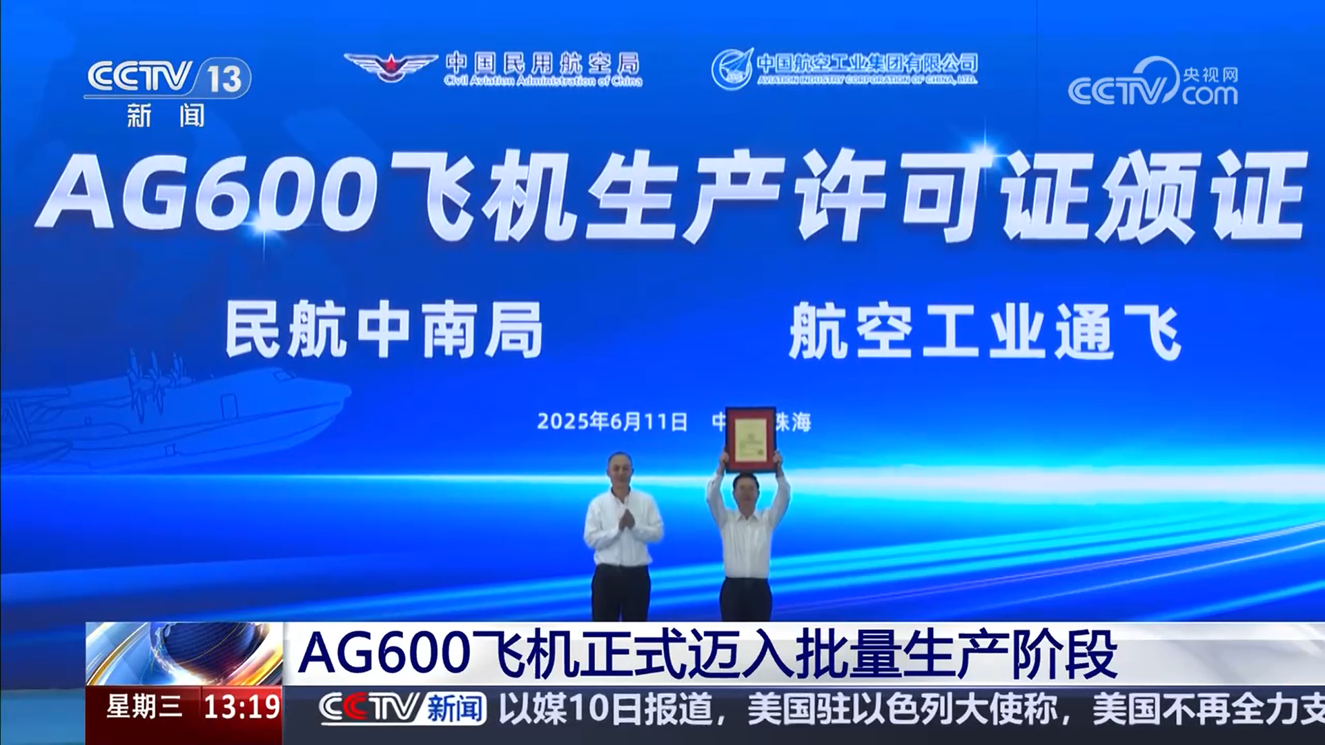 央视网消息:记者6月11日从中国航空工业集团了解到,由我国自主研制的大型水陆两栖飞机AG600在广东珠海取得由中国民航局颁发的生产许可证,这标志着AG600飞机正式迈入批量生产阶段。