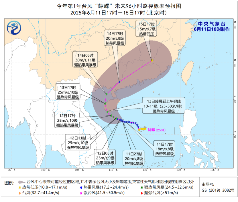 大风预报:6月11日20时至12日20时,南海大部、北部湾、琼州海峡、西沙群岛、南沙群岛、中沙群岛、广东沿海、海南岛沿海、广西沿海将有6-8级风,阵风9-10级,台风中心经过的附近海域风力可达9-11级,阵风12-13级。