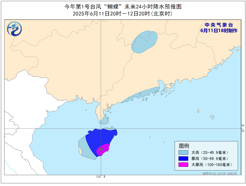 降水预报:6月11日20时至12日20时,广东北部和中西部沿海、海南岛大部、西沙群岛等地有大雨,其中,海南岛中东部的部分地区有暴雨或大暴雨(100-160毫米)。