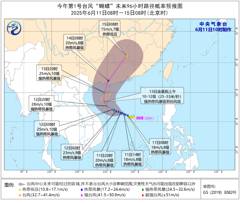 大风预报:6月11日14时至12日14时,南海大部、北部湾、琼州海峡、西沙群岛、南沙群岛、中沙群岛、广东沿海、海南岛沿海将有6-8级风,阵风9-10级,台风中心经过的附近海域风力可达9-10级,阵风11-12级。