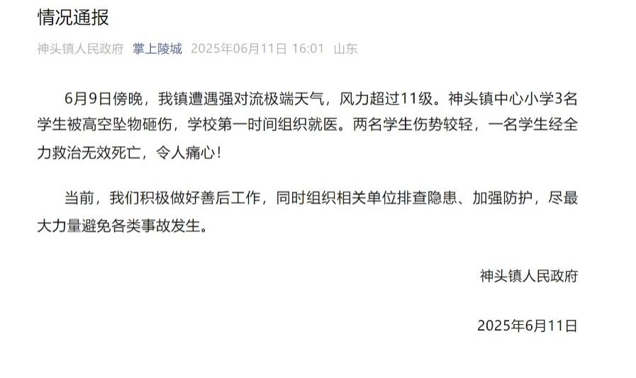 ·山东德州通报:3名学生被高空坠物砸伤,1名学生经全力救治无效死亡。
