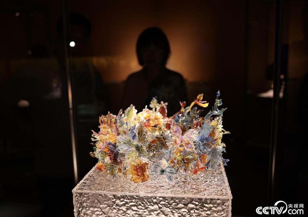 中国国家博物馆内观众在观看刘媛作品《蝴蝶灵蛇花冠》。