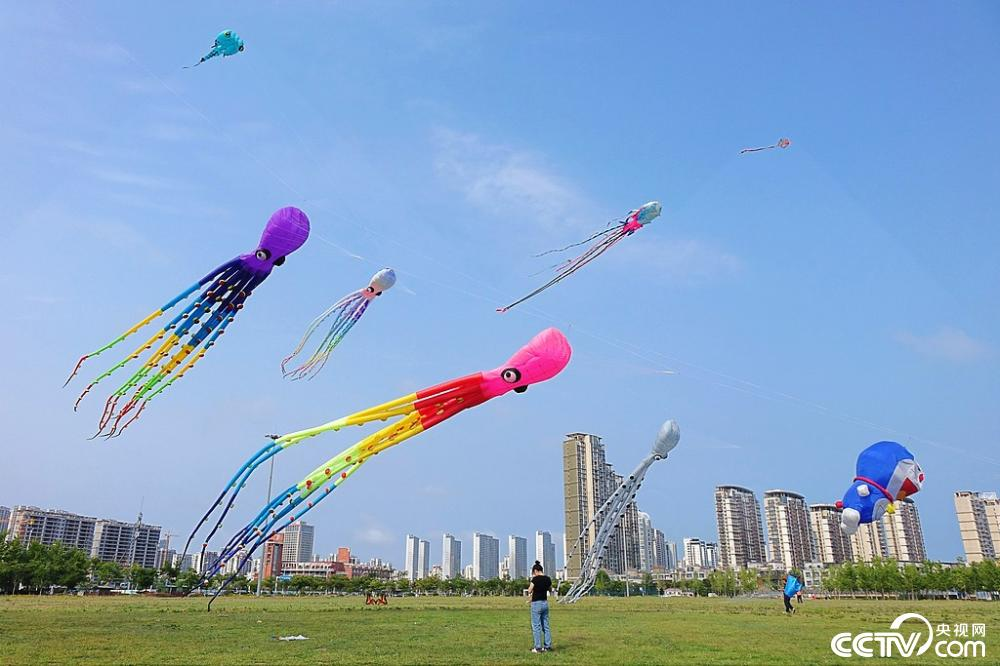 山东青岛西海岸新区唐岛湾北岸城市空间上空,造型各异的海洋主题风筝飘舞,为夏日滨海旅游增添了一片欢乐氛围。