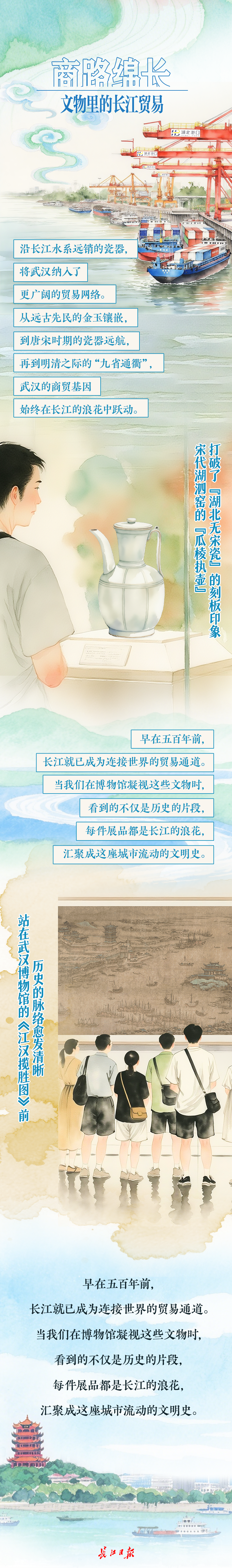 1898年,张之洞在奏折中正式将汉口镇冠以“九省通衢”之名,但武汉作为贸易枢纽的故事,早在商周时期就已开始书写。站在武汉博物馆的《江汉揽胜图》前,历史的脉络愈发清晰。江上千帆竞发,岸上屋舍鳞次栉比,城墙逶迤如龙,它们共同诉说着一个事实:早在五百年前,长江就已成为连接世界的贸易通道。今天,当我们在博物馆凝视这些文物时,看到的不仅是历史的片段,每件展品都是长江的浪花,汇聚成这座城市流动的文明史。