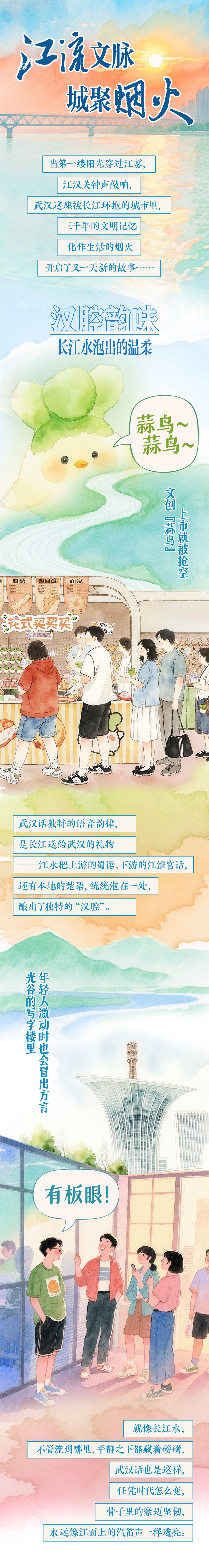 清晨的武汉街头,一声声邻里间“过早了冇?”的问候,混着芝麻酱的香气飘进楼道。这声调,和三百年前汉口码头上喊“起锚开船”的船工没什么两样。最近几年,武汉话总在不经意间火出圈。央视元宵晚会上,《汉阳门花园》唱哭亿万观众;文创“蒜鸟”上市就被抢空。武汉话就像长江水,表面粗犷奔涌,细品却带着绵长的回甘,它的底色里藏着长江水泡出的温柔。