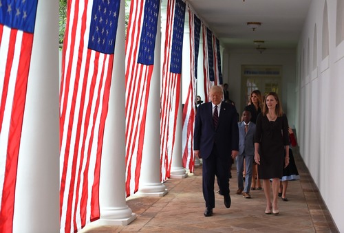 2020年9月26日,在第一任期的美国总统特朗普(前左)和时任美国联邦第七巡回上诉法院法官艾米·科尼·巴雷特(前右)出席在华盛顿白宫玫瑰园举行的提名公布活动。特朗普当天提名巴雷特为联邦最高法院大法官。新华社/法新