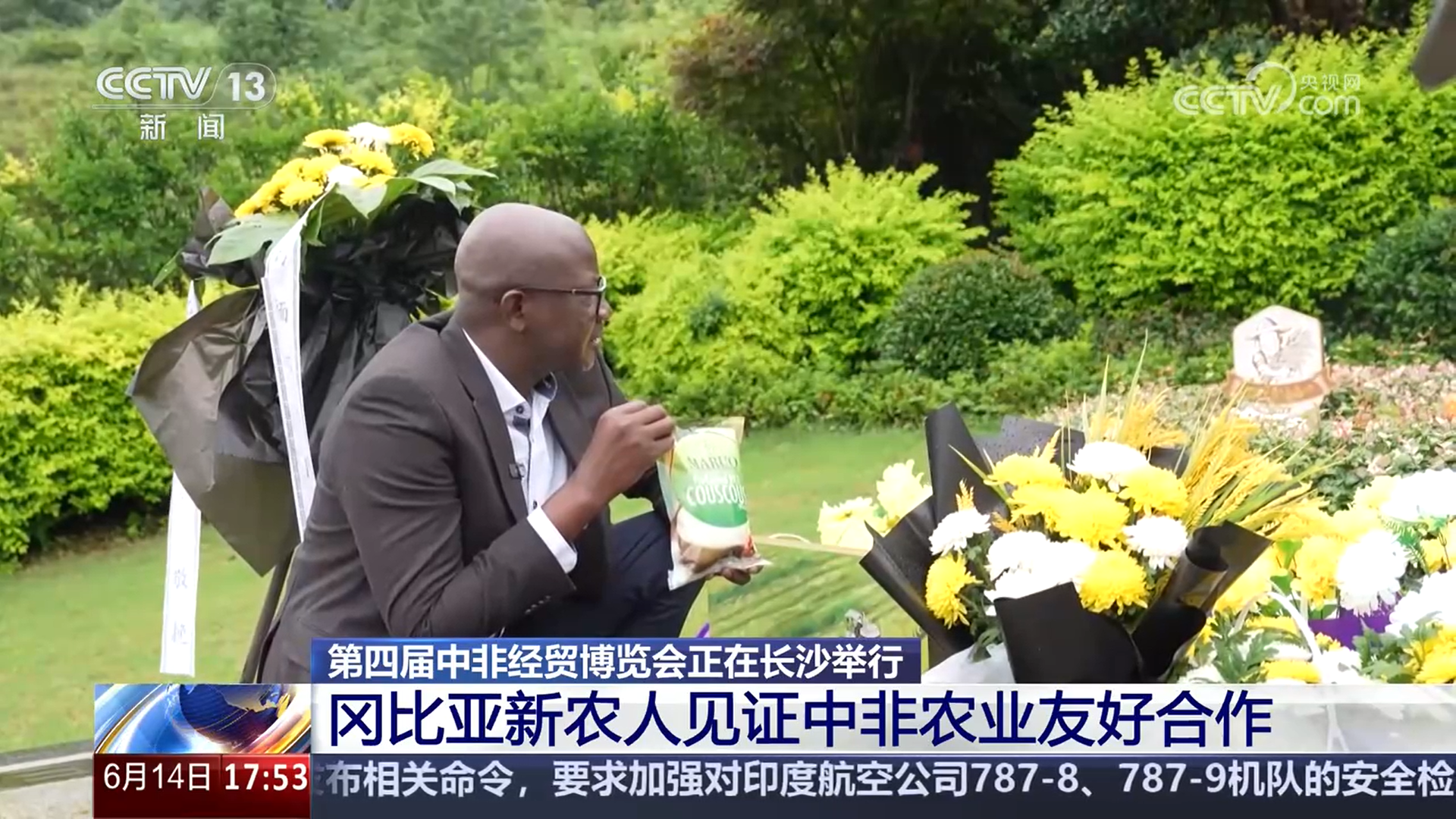 在第四届中非经贸博览会的展馆里,琳琅满目的先进机械牢牢吸引了穆萨的目光,学习更多中国农业技术和现代化经验,这正是穆萨来到博览会现场的一个重要目的。6月11日,细雨蒙蒙中,他把自己带来的稻米和自家农场的油画,恭敬地放在了袁隆平院士的墓前。这袋稻米意义非凡:是袁隆平院士的团队手把手教穆萨在冈比亚土地上种出来的。