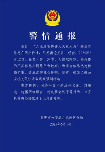 ·散布“九龙坡石桥铺大火系人为”谣言,男子已被重庆公安机关依法采取刑事强制措施。