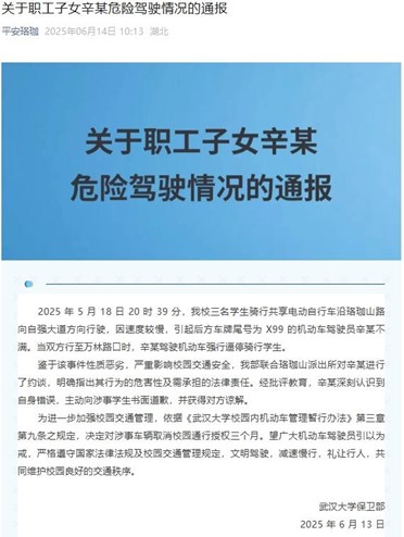 ·武汉大学保卫部:职工子女强行逼停骑行学生,联合派出所约谈。