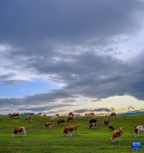 夏日,内蒙古赤峰市阿鲁科尔沁草原绿意盎然,牧群在草原上觅食,呈现出一幅和谐的生态画卷。