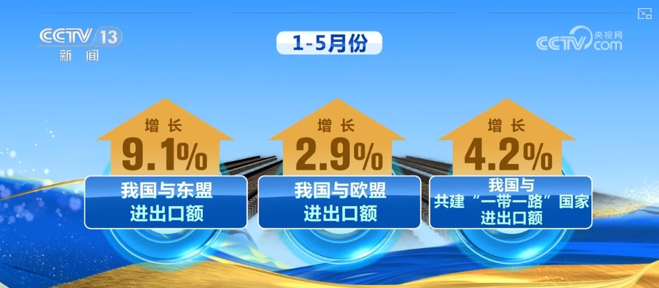 从贸易伙伴看,尽管对美进出口有所下降,但对于东盟、欧盟、共建“一带一路”国家进出口保持增长,体现出我国外贸多元化发展的积极成效。1—5月份,我国与东盟、欧盟、共建“一带一路”国家进出口额分别增长9.1%、2.9%、4.2%。