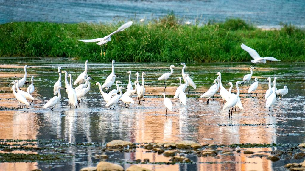 2023年8月29日,一群白鹭在淅川县丹江湿地内嬉戏。新华社发(张建林 摄)
