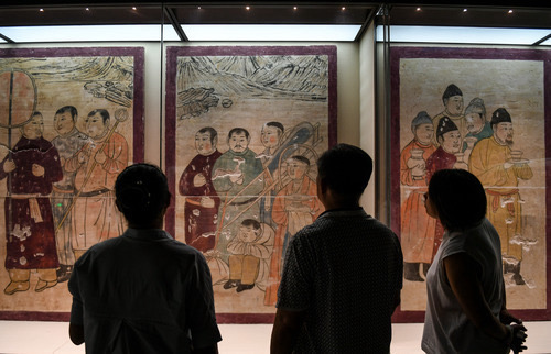 游客在观看辽上京博物馆内的辽代墓葬壁画。新华社记者彭源摄