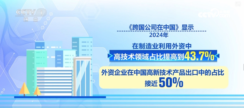 《跨国公司在中国》报告指出,跨国公司促进中国提升开放型经济水平,推动中国加速形成新质生产力。2024年,在制造业利用外资中,高技术领域占比提高到43.7%,外资企业在中国高新技术产品出口中的占比接近50%。