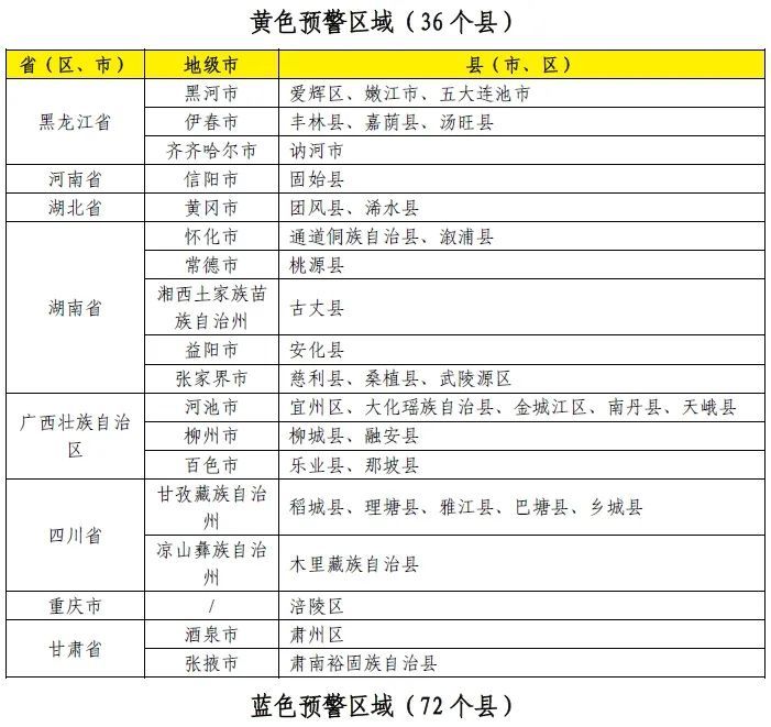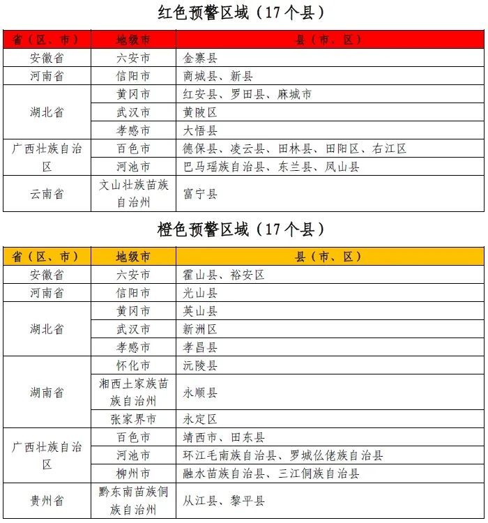 预计,6月20日20时至6月21日20时,安徽西部、河南东南部、湖北东部、湖南北部、广西北部和西部、贵州东南部、云南东部等地部分地区发生山洪灾害可能性大(橙色预警),其中,安徽西部、河南东南部、湖北东部、广西西部、云南东部局地发生山洪灾害可能性很大(红色预警),预警区域涉及的县(市、区)见下表。其他地区也可能因局地短历时强降水引发山洪灾害,请各地注意做好实时监测、防汛预警和转移避险等防范工作。