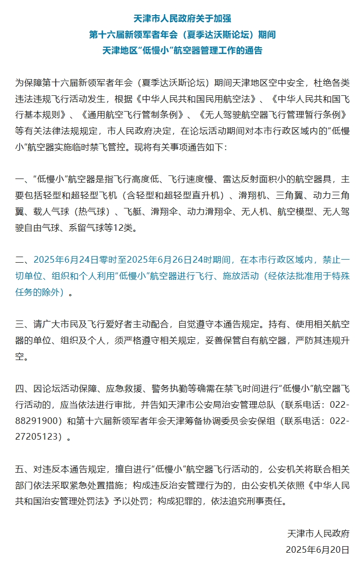 央视网消息:据“天津发布”微信公众号消息,为保障第十六届新领军者年会(夏季达沃斯论坛)期间天津地区空中安全,杜绝各类违法违规飞行活动发生,根据《中华人民共和国民用航空法》、《中华人民共和国飞行基本规则》、《通用航空飞行管制条例》、《无人驾驶航空器飞行管理暂行条例》等有关法律法规规定,天津市人民政府决定,在论坛活动期间对天津市行政区域内的“低慢小”航空器实施临时禁飞管控。