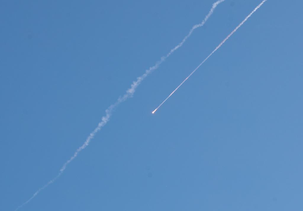 这是6月22日在耶路撒冷上空拍摄到的导弹痕迹。新华社记者陈君清摄
