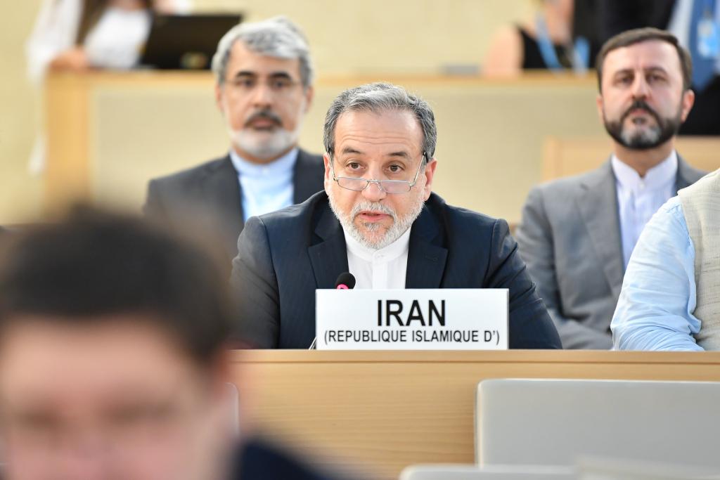6月20日,在瑞士日内瓦万国宫,伊朗外交部长阿拉格齐(中)在联合国会议上发言。新华社记者连漪摄