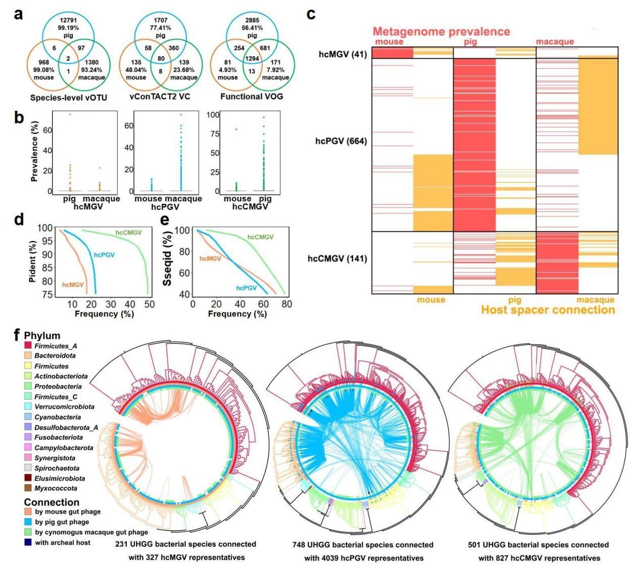 研究团队利用生物信息学方法,对约1500个小鼠、猪和食蟹猴肠道宏基因组进行高效标准化分析,成功构建了三种模式动物的高质量数据库,其中包括977条小鼠、12896条猪以及1480条食蟹猴种水平、完整度超过90%的高质量病毒序列。