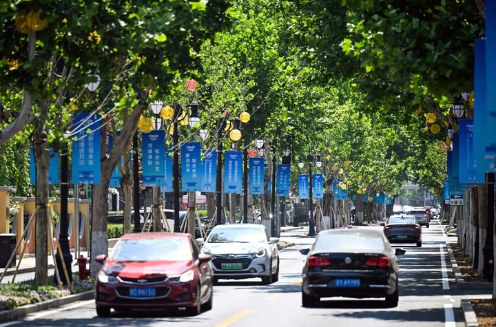 在天津市和平区泰安道,道路两旁的路灯上悬挂着2025夏季达沃斯论坛宣传标语(6月21日摄)。新华社记者 赵子硕 摄