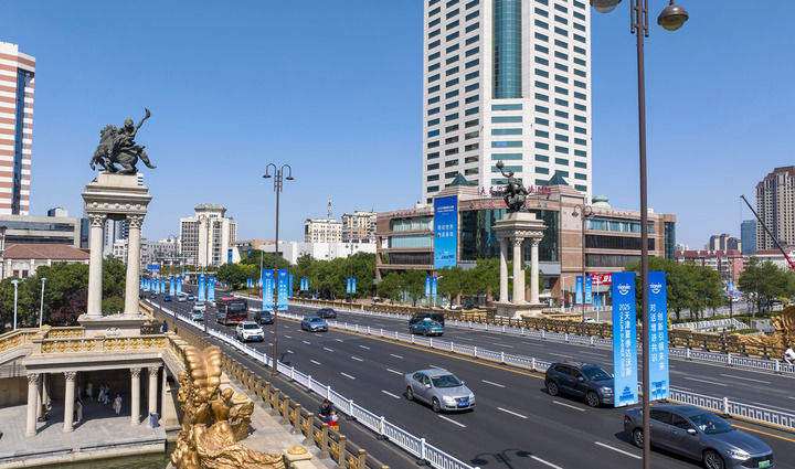 天津市大光明桥道路两旁路灯上悬挂着2025夏季达沃斯论坛宣传标语(6月21日摄)。新华社记者 赵子硕 摄