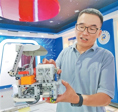 蒋际君在展示学生设计制作的机器人。王 琨摄