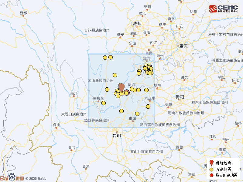历史地震:根据中国地震台网速报目录,震中周边200公里内近5年来发生3级以上地震共113次,最大地震是2024年4月6日在云南昭通市鲁甸县发生的4.9级地震(距离本次震中36公里),按震级大小前50次历史地震分布如图。
