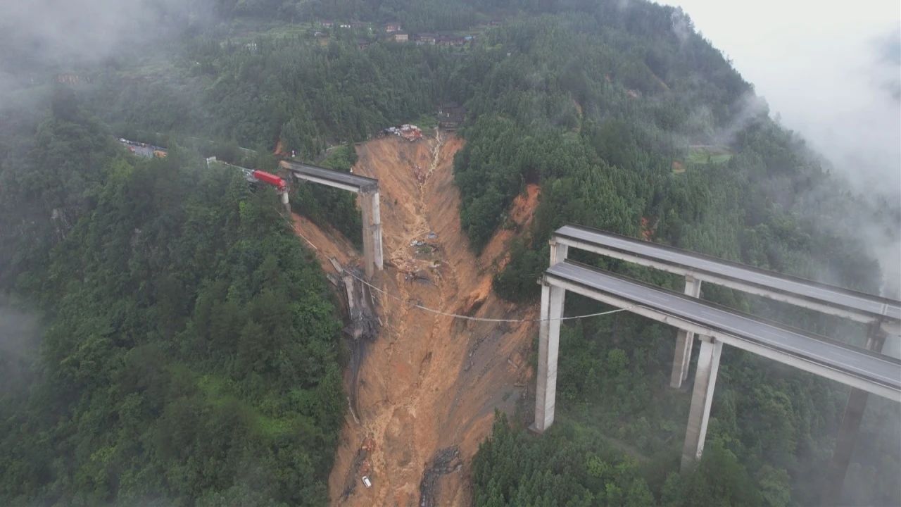 央视网消息:据贵州省消防救援总队,6月24日7时40分许,G76厦蓉高速格都线广西至贵州都匀方向K1264处(贵州省三都水族自治县境内)猴子河特大桥,因持续强降雨诱发山体滑坡,导致引桥发生垮塌。
