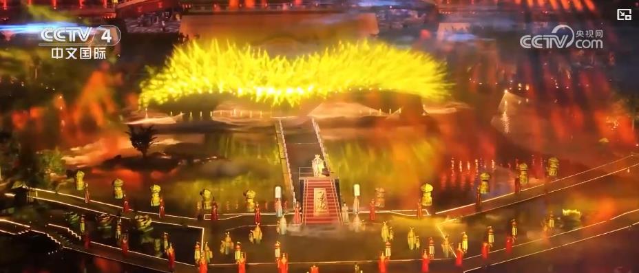 水雾升腾,光影流转,上百名演员身着唐代复原服饰,通过舞蹈、武术、杂技等演绎形式,生动重现了武则天登基称帝、开创武举、推广牡丹、迎接使臣等盛唐图景。