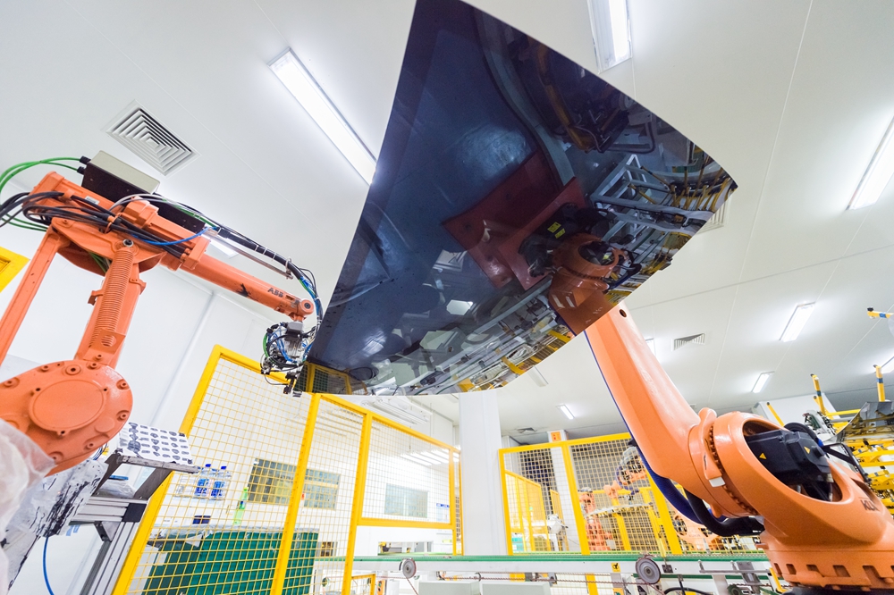机械臂在福耀汽车玻璃智能工厂的车间生产玻璃产品