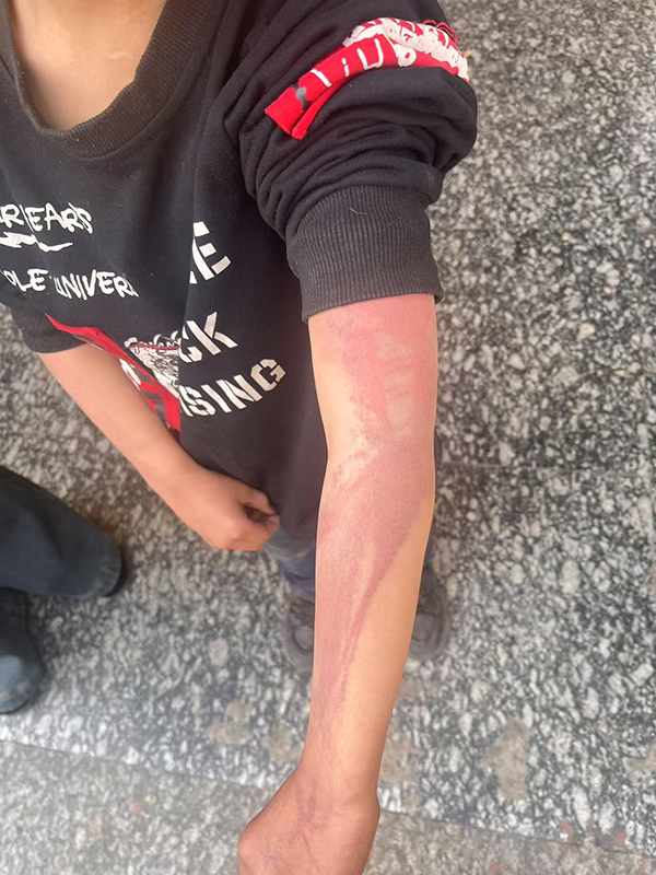 江林看到儿子除了脚底板是好的,其背部、臀部、下肢等部位都存在不同程度的淤血青紫肿胀。据彭小小跟她说,爸爸会用皮带抽打他,打累了,后妈继续抽打。大腿的伤是用扳手锤的。