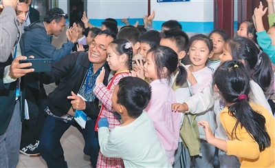 参加共建“一带一路”国家教师队伍建设国际研讨班的学员(左)与小学生合影。新教育研究院供图