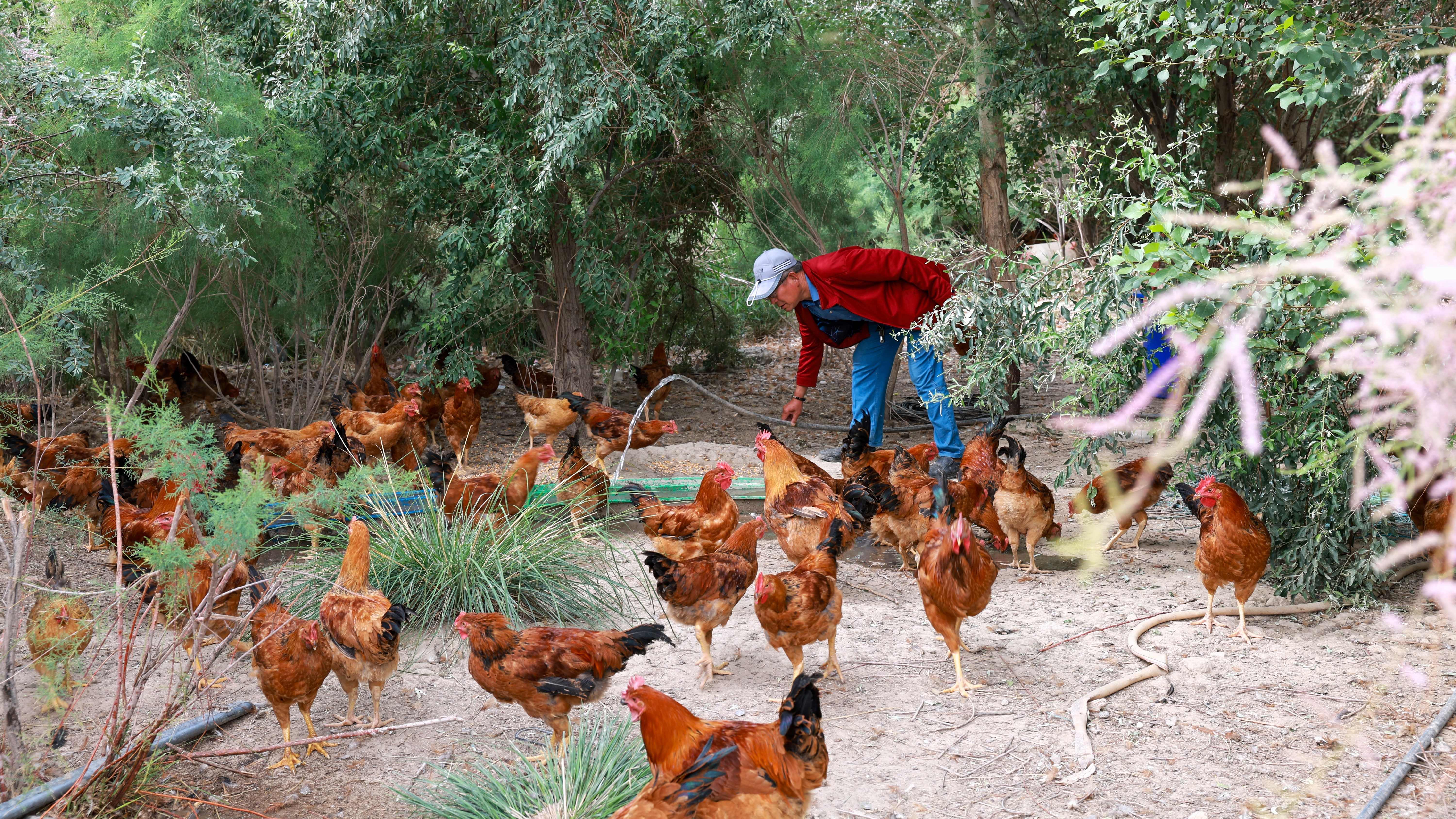 央视网消息:6月25日,甘肃省金塔县西坝镇林下生态鸡场,沙枣林郁郁葱葱,成群的土鸡在沙枣林间悠闲溜达、觅食,养殖户穿梭其中,忙着喂食、喂水、捡拾鸡蛋。