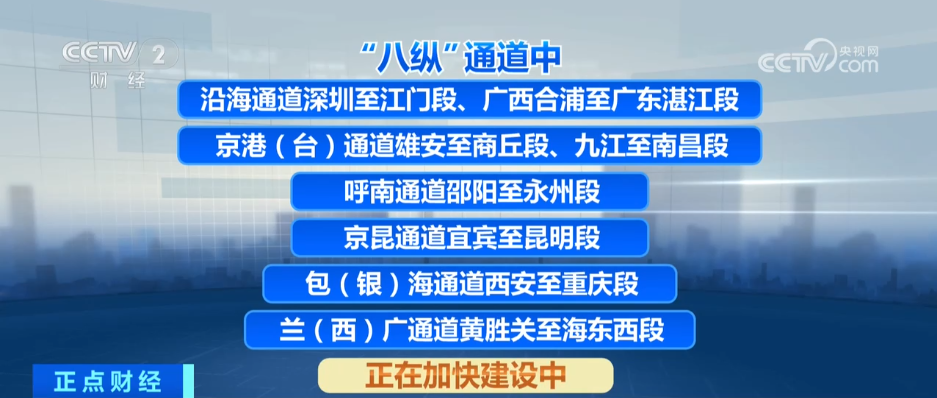 经过近十年建设,京沪通道、京哈—京港澳通道、青银通道、陆桥通道、沪昆通道、广昆通道等已实现贯通。“八纵”通道中沿海通道深圳至江门段、广西合浦至广东湛江段;京港(台)通道雄安至商丘段、九江至南昌段;呼南通道邵阳至永州段;京昆通道宜宾至昆明段;包(银)海通道西安至重庆段;兰(西)广通道黄胜关至海东西段正在加快建设中,包(银)海通道延安至西安段预计年内通车。“八横” 通道中沿江通道成都至达州至万州高速铁路正在建设;京兰通道包头至惠农段、沿江通道武汉至宜昌段预计年内通车。“铁路投资对全社会投资带动效应不断凸显,未来将会为区域经济社会协调发展注入新动力。”相关部门负责人表示。